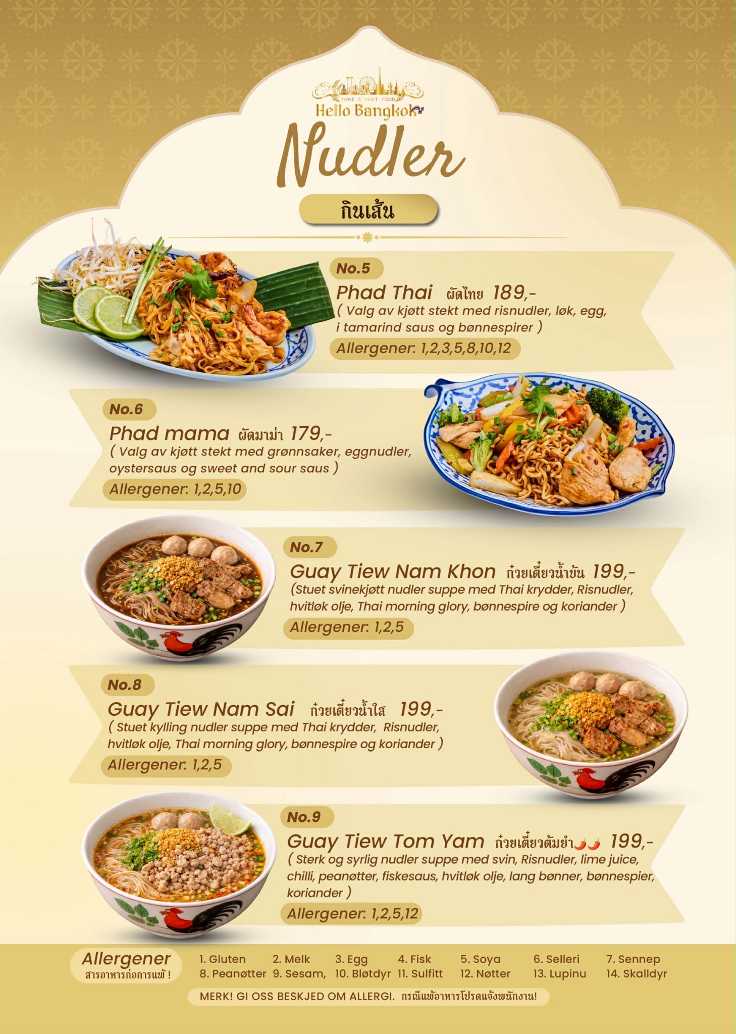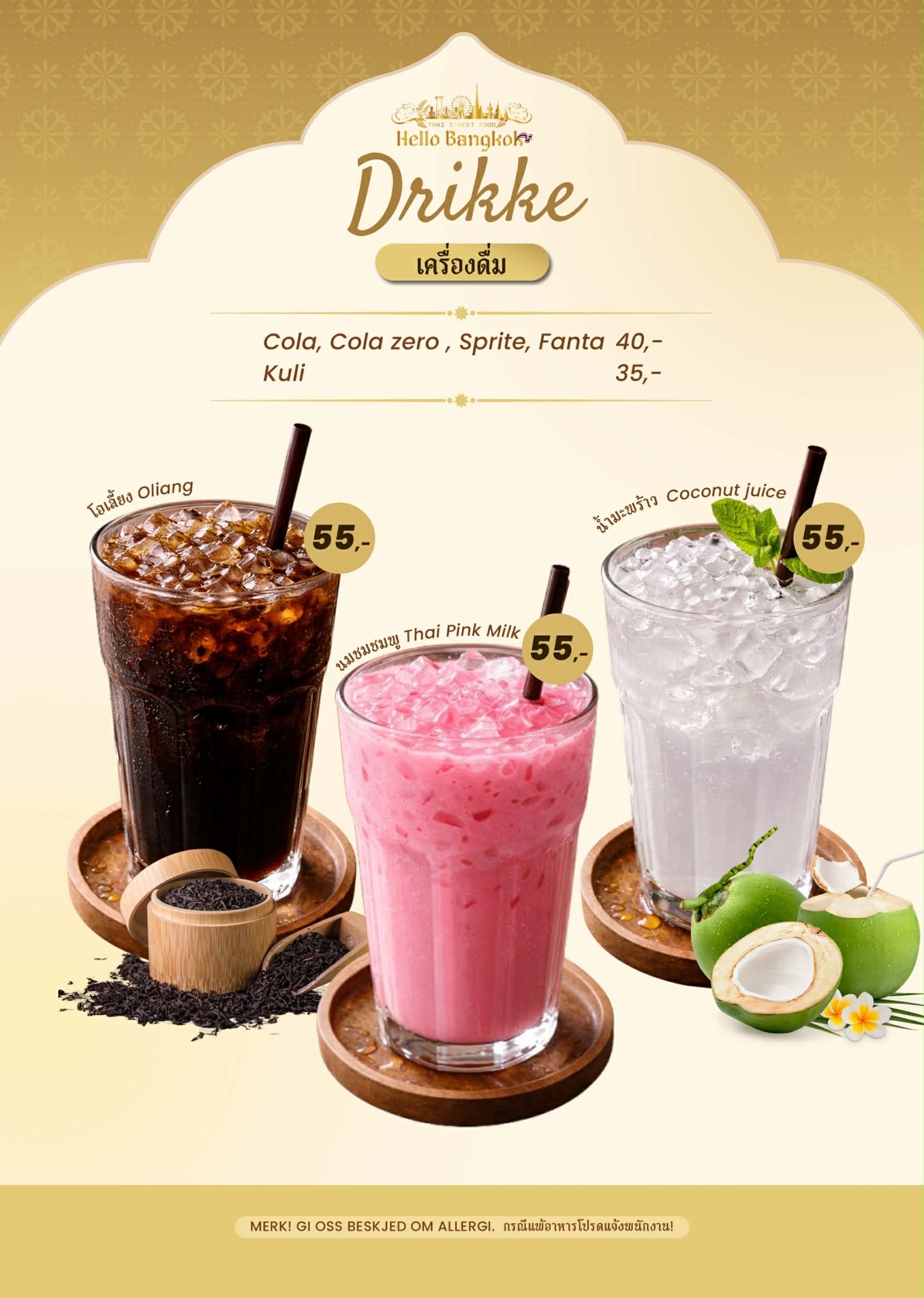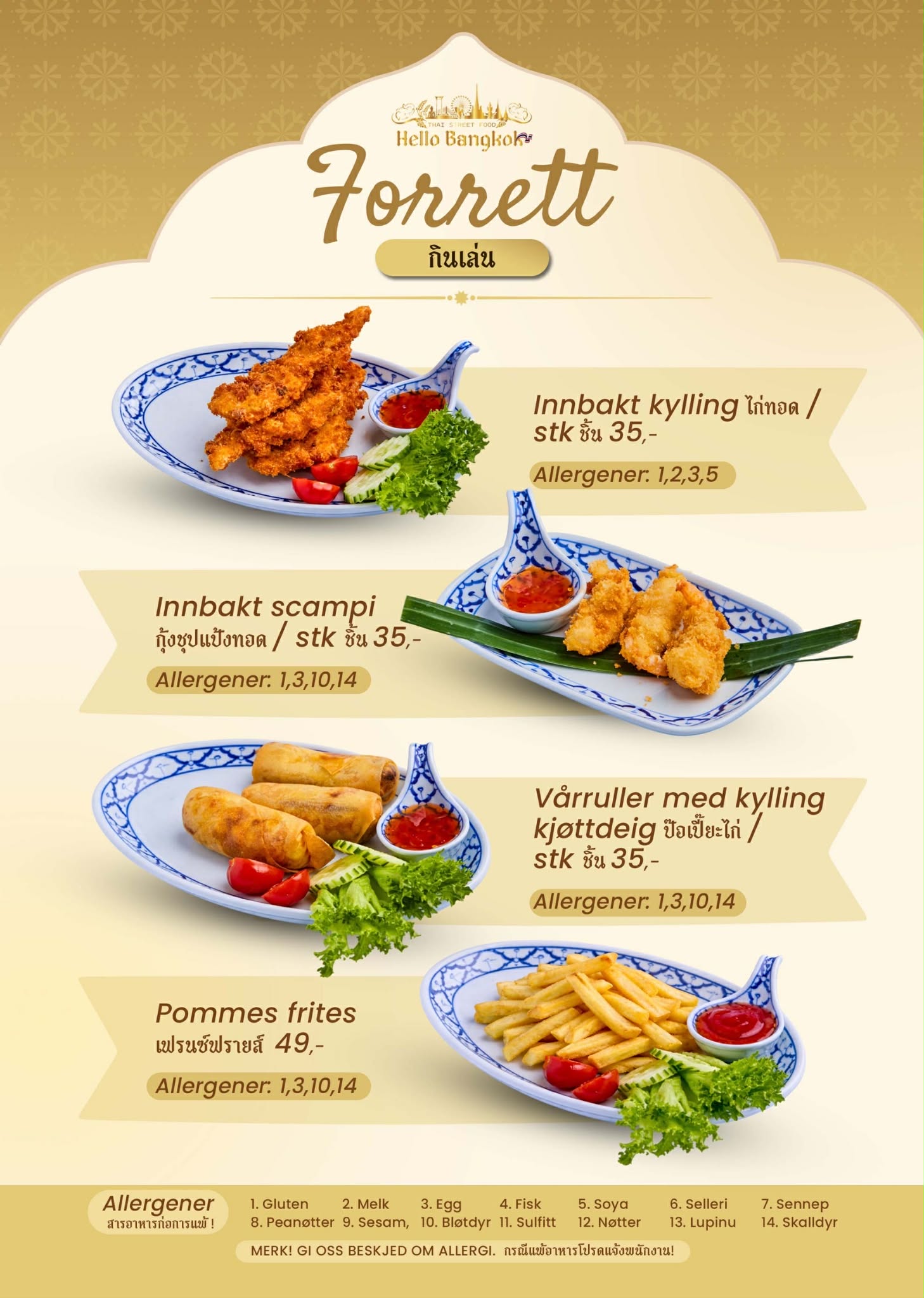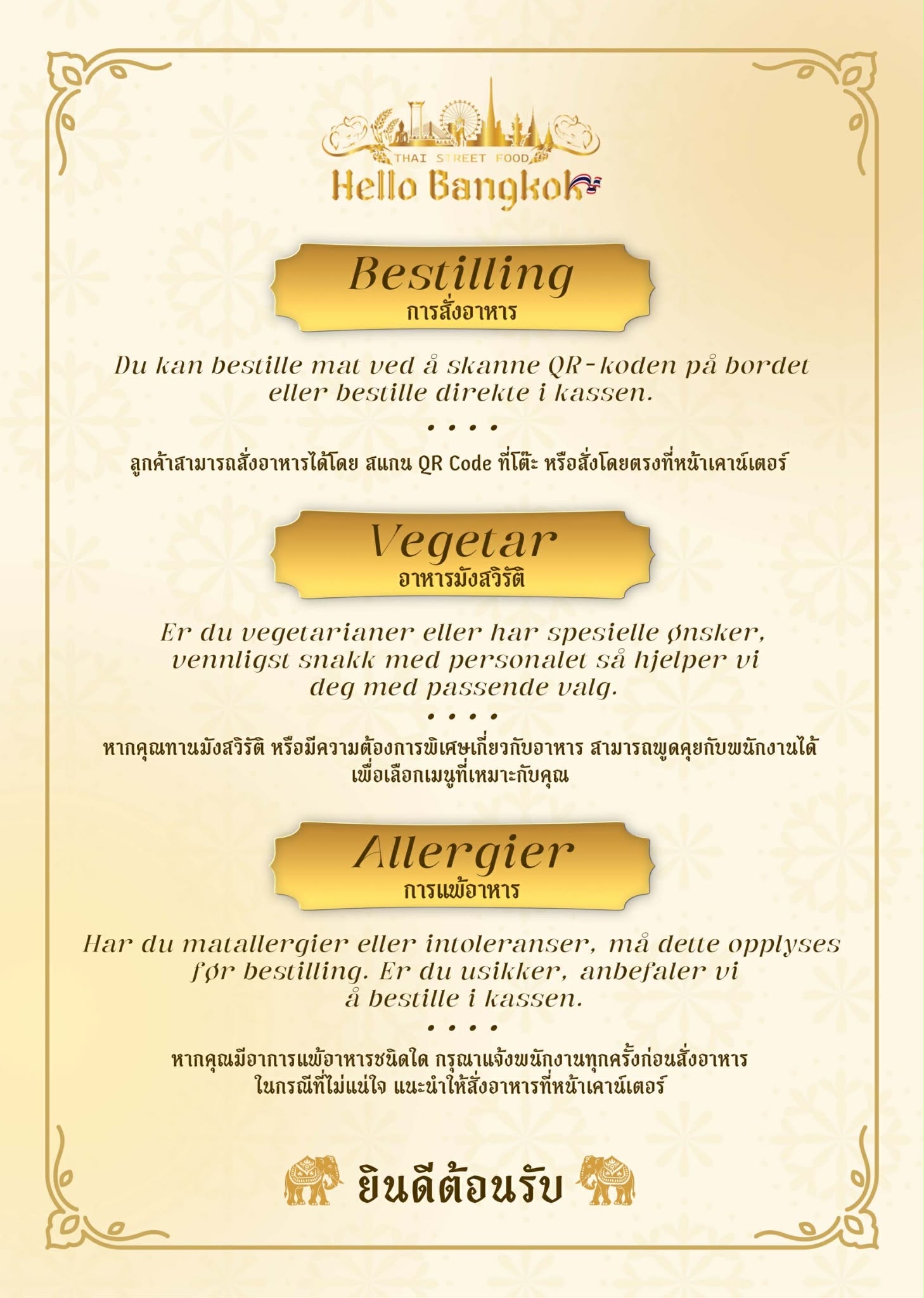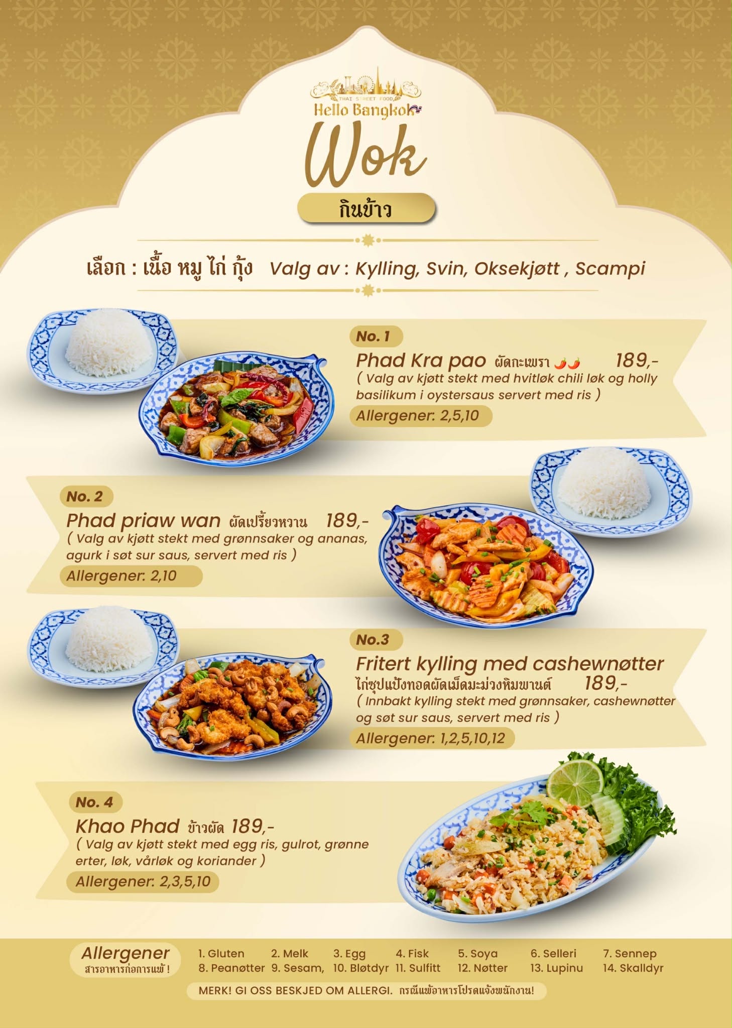 Hello Bangkok Thai Street Food tilbyr autentisk thailandsk street food laget med ferske råvarer og ekte smaker fra Thailand. Vi kombinerer tradisjonelle oppskrifter med et moderne uttrykk – perfekt for både en rask lunsj og et hyggelig måltid i senteret.